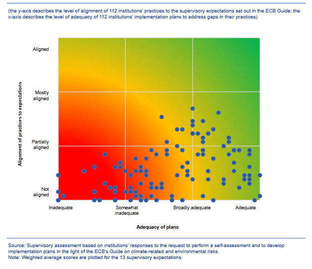 Concluding, the ECB found the quality of the plans too low, and progress to actually implement the expectation into a bank’s practice too slow. Especially, the current alignment of the banks’ practices with the ECB expectation was substandard. See the interesting ECB diagram below.