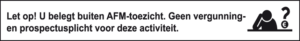 Het gaat om de zwart met witte balk met een pictogram van een nadenkend/studerend poppetje, waarin de volgende tekst is opgenomen (of een combinatie daarvan): “U belegt buiten AFM-toezicht. Geen vergunningplicht/prospectusplicht voor deze activiteit.”